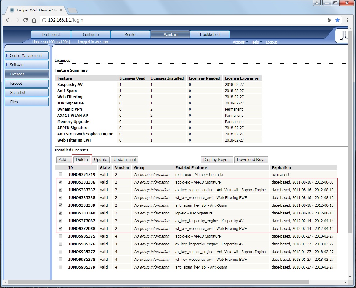 如何刪除過期的SRX Kaspersky AV Licenses病毒防護授權