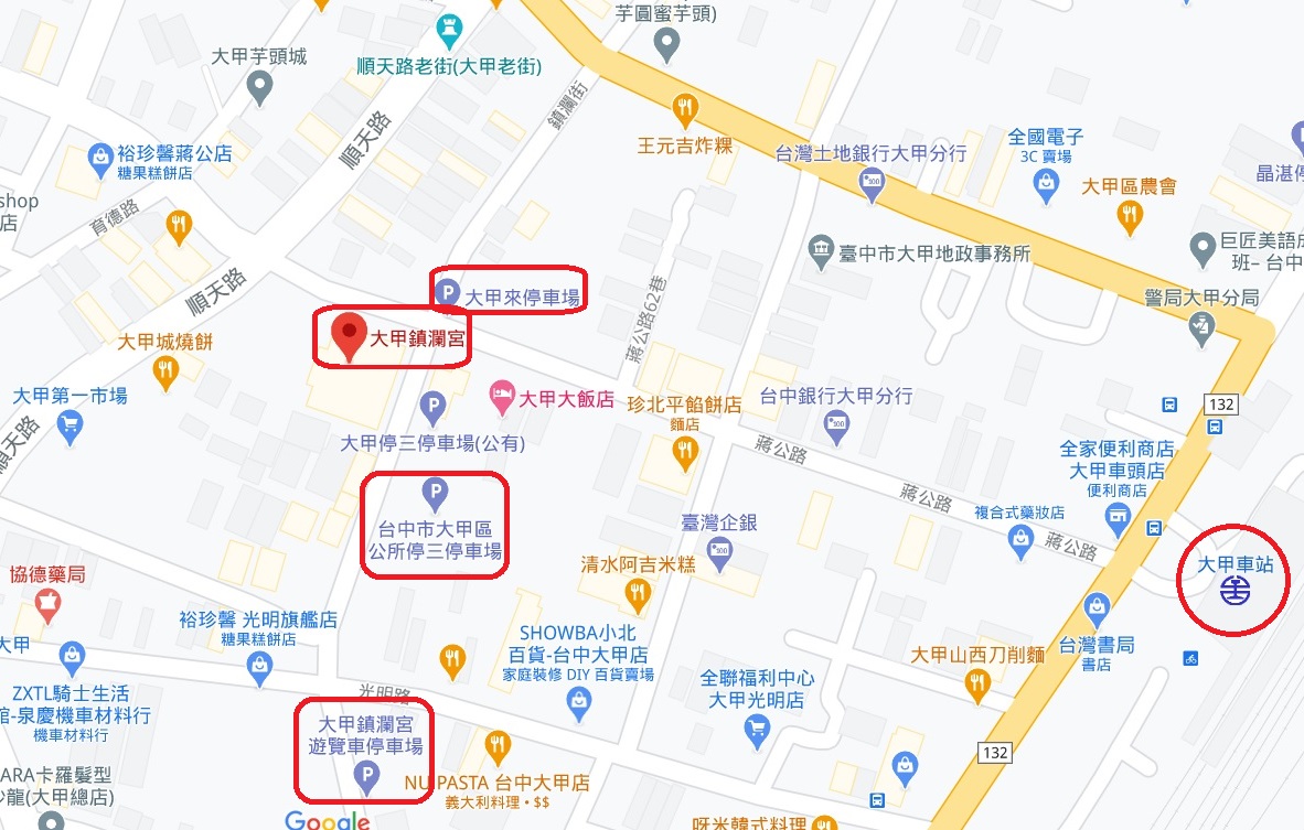 中山高后里交流道下→往大甲(甲后路台132線)方向行駛→過地下橋左轉中山路一段→於大甲火車站前蔣公路右轉直行即可抵達。