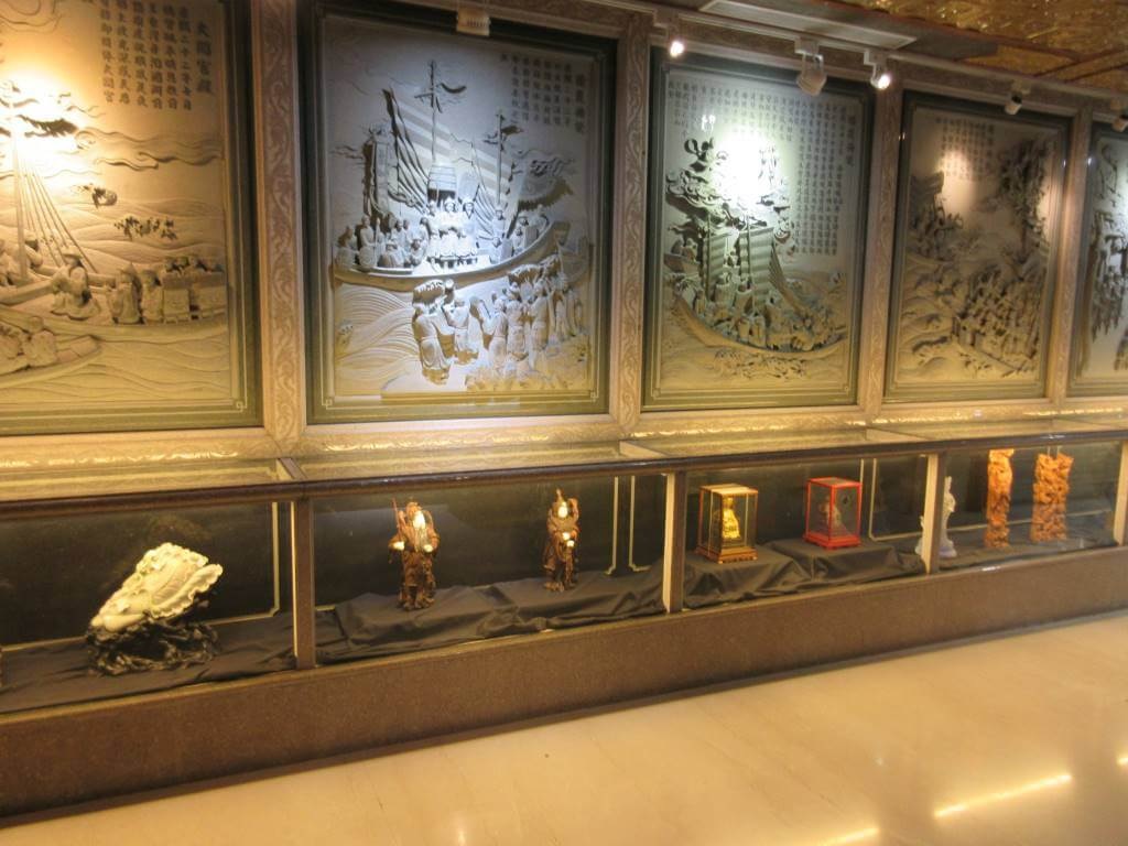 下圖為展示廳牆壁上的石雕作品,以及展示文物。