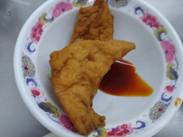 而下面的三角豆腐口味則一般般,只是小弟覺得不夠鹹,於是便找了甜辣醬來調味。