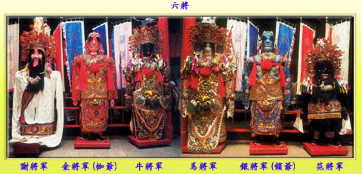 一般都認為人從出生到死亡都由城隍爺監管。換句話說,人不管為善或作惡,城隍爺都有記錄。城隍爺旁邊的文判官手上拿的一本就是記載人一生功過的生死簿。人一但過世,城隍爺即派謝將軍及范將軍(一般稱為七爺八爺,新竹都城隍廟則稱為大爺二爺)予以拘提到城隍廟。經過判決以後可能可以升天入仙班,也可能被判下地獄第幾層,鐵算盤就是用來計算功過之用。然後即由金將軍銀將軍(俗稱大鬼小鬼,也有稱枷爺鎖爺)負責連同生死簿一起移送。所以閻羅王的生死簿就是由城隍爺移送過去的。這時牛將軍馬將軍(俗稱牛頭馬面)站在奈何橋上依據判決內容而讓路升天或踢入地獄。牛將軍力大無窮,馬將軍快速無比,任何人想要脫逃是不可能的。這就是城隍爺座前六位將軍的由來。