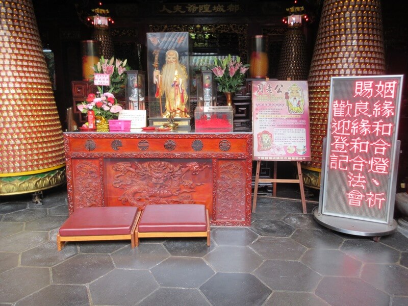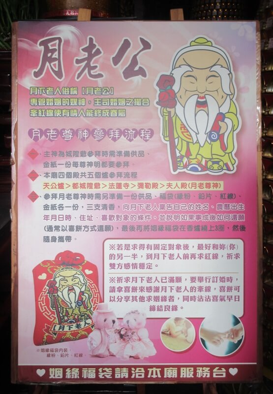 月老尊神(月下老人) 近年來求姻緣者多,新竹城隍廟於民國己丑(九十八)年八月,請月下老人坐鎮新竹城隍廟後殿,廣牽姻緣,已成為城隍廟另一大特色。