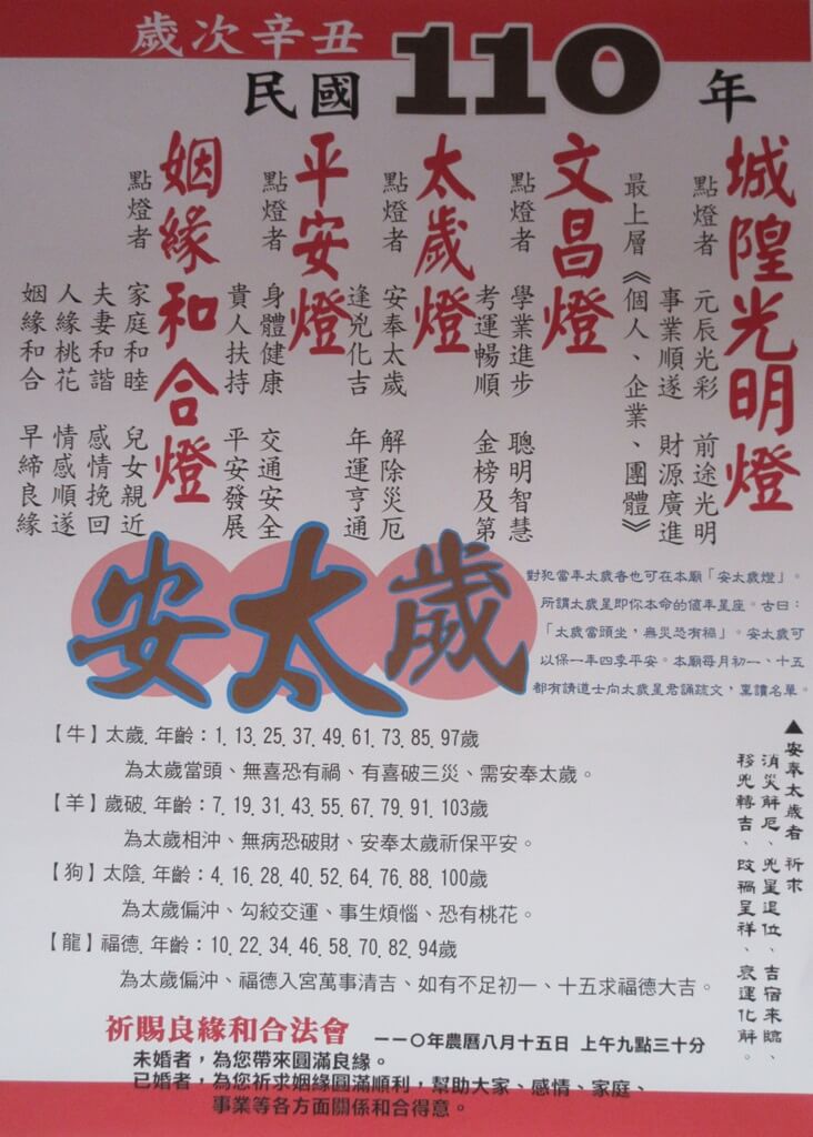 城隍光明燈:點燈者,元辰光彩、前途光明、事業順遂、財源廣進。