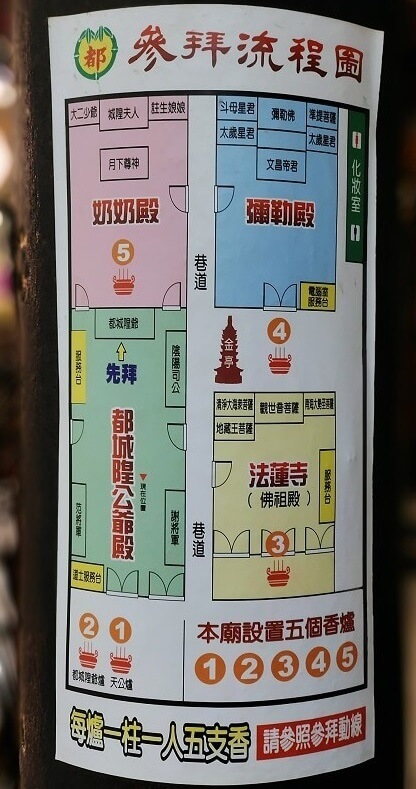 PS:關於參拜步驟我們根據廟方公布的流程(如上圖)可以得知首先要參拜的是城隍爺(參拜但不上香),接著參拜天公爐並上香,然後繞拜諸神,接著才到城隍爐上香,廟方網站上的參拜程序(如上面的網路連結),如下: