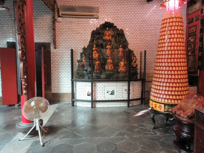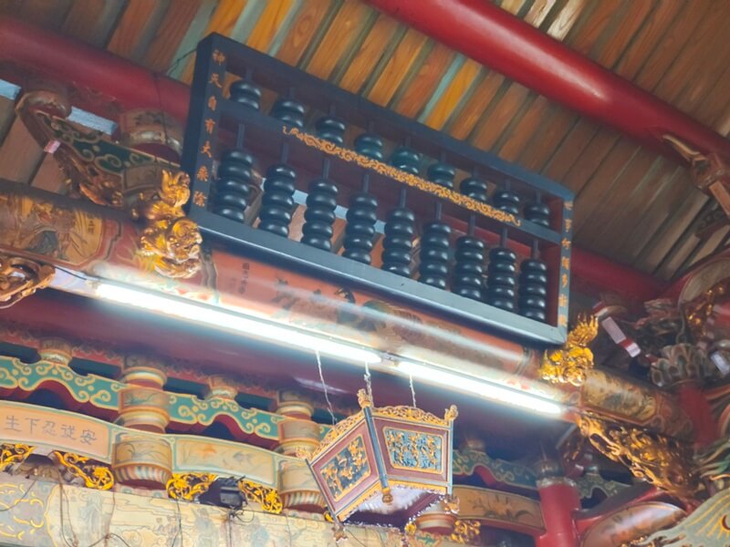 而屋樑上的大鐵算盤,據傳是城隍爺用來計算人世罪惡的,所以兩旁的對聯寫著『世事何須多計較,神天自有大乘除』,下圖為大鐵算盤的照片,您還可參考下列之網路連結。