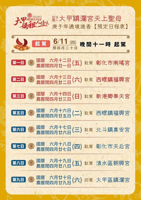 每年農曆三月,來自各地的十餘萬信徒組成聲勢浩大的進香隊伍,以大甲鎮瀾宮為出發點,在九天八夜中徒步至南部來回,堪稱是台灣地表最大規模遷徙活動。