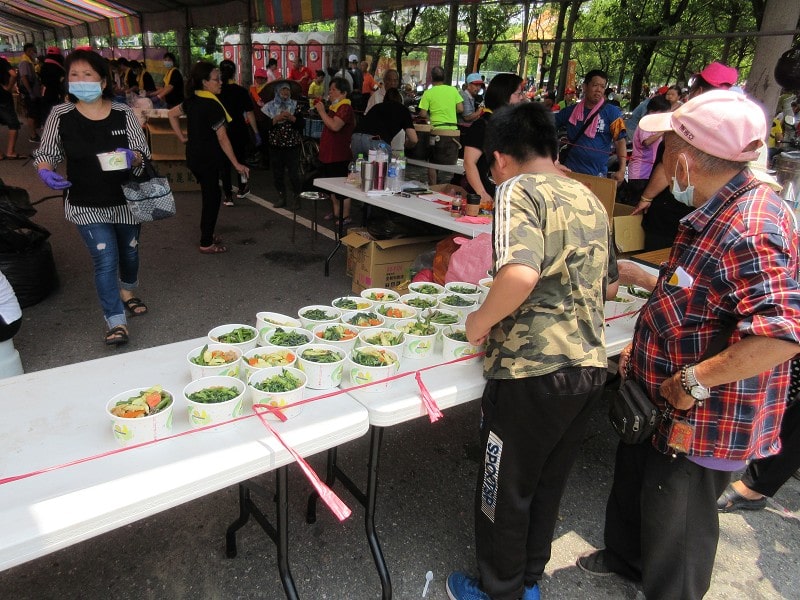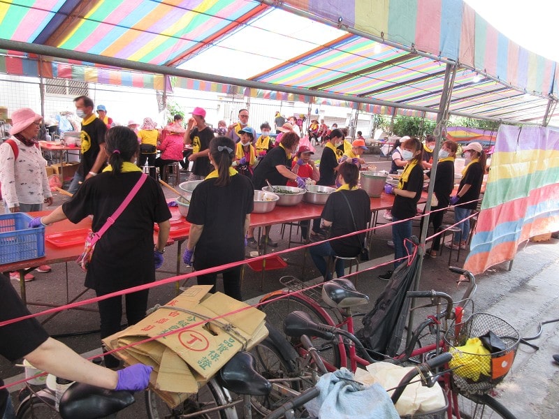 在棚架前方放置有完成的餐點,這是由廟方免費提供給信眾們食用的。