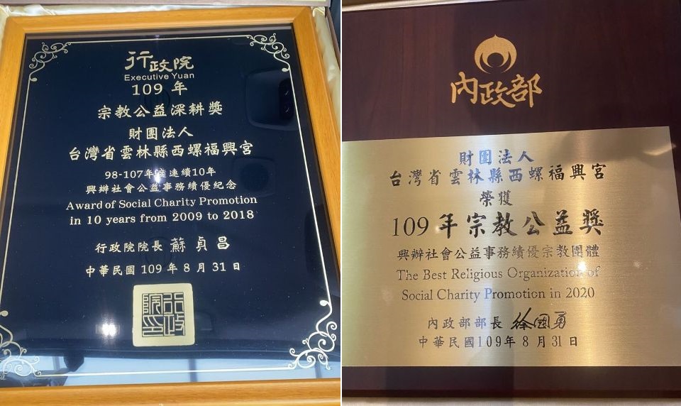 2020年8月 榮獲行政院頒贈「宗教深耕獎」殊榮,98~107年度連續10年興辦社會公益事務績優紀念。 連續11年榮獲內政部頒贈「宗教公益獎」殊榮,給予興辦社會公益事務績優宗教團體的肯定。