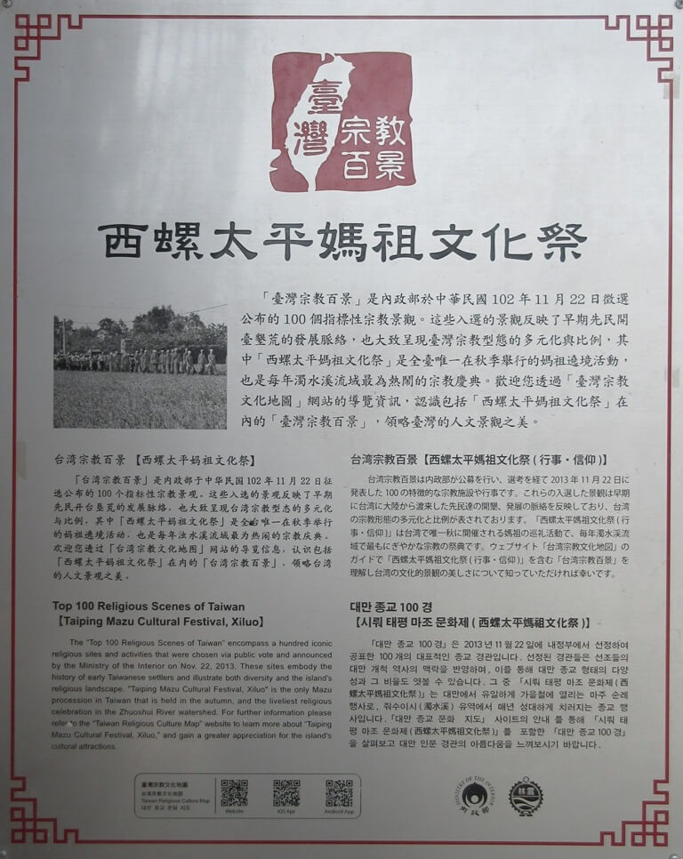 西螺太平媽祖文化祭於102年入選為「臺灣宗教百景」之一。