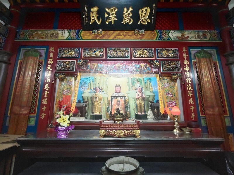 後殿中龕祭祀觀音佛祖,慈眉善目,和祥可親。左右侍立金童玉女,一曰善財,一曰龍女,以供觀音遣使。左右楹聯「尊肇南海傳經浪岸憑千手,教自西天法雨慈雲播十方」,一語闡明觀音渡眾濟民之恩澤。右龕供奉註生娘娘,掌天下蒼生之子嗣生息,暨土地公、土地婆共孚眾信膜拜。左龕供奉尤府王爺,點金柱上「永世有因大悲觀自在,諸天無相極樂佈文殊」之對聯,暗藏禪機。環視兩壁,各彩繪九尊羅漢,盡皆潛修靜坐,心神入定。